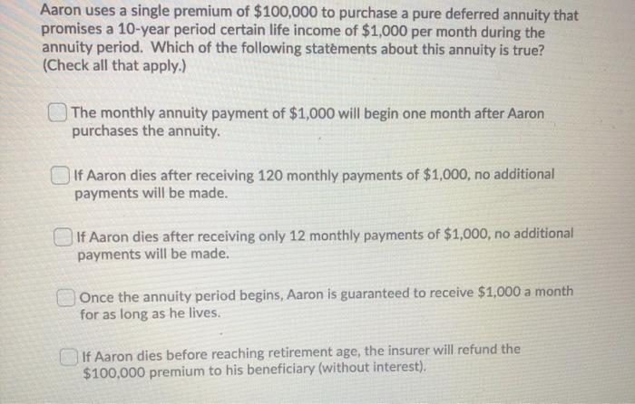 Solved Aaron Uses A Single Premium Of 100 000 To Purchase A Chegg Com